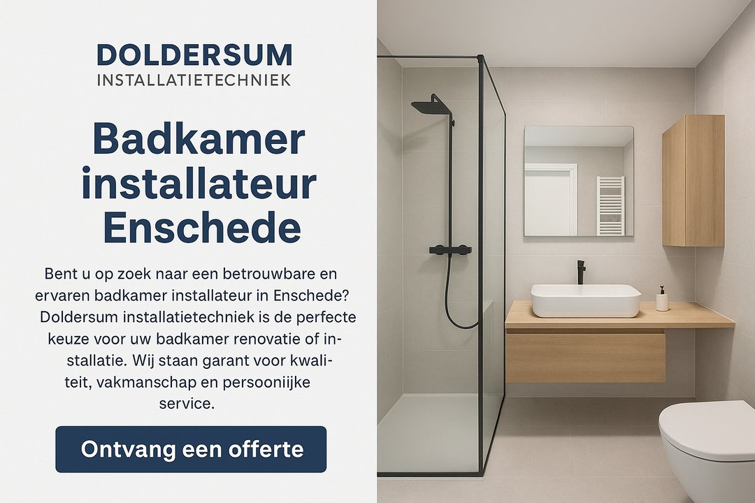 Doldersum Installatietechniek: dé badkamer installateur in Hengelo, Almelo en Enschede voor badkamer renovatie en nieuwe badkamers plaatsen. Doldersum Installatietechniek is dé specialist in badkamer renovatie, badkamer verbouwen en het plaatsen van een nieuwe badkamer in Hengelo, Almelo en Enschede. Als ervaren badkamer installateur bieden wij oplossingen, zoals complete badkamer renovatie Almelo en het laten installeren van uw badkamer met oog voor detail en kwaliteit. Of u nu een nieuwe badkamer wilt aanleggen of uw huidige badkamer wilt verbouwen, wij zorgen voor een vakkundige en zorgeloze uitvoering. Kies voor vakmanschap en betrouwbaarheid met Doldersum Installatietechniek – uw partner voor badkamers in Hengelo, Almelo en Enschede.